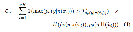 결과적으로 unlabeled loss는 다음과 같이 도출할 수 있게 됩니다. 참고로 T_c^t가 앞서 구한 c 클래스에 대한 adaptive threshold가 됩니다.