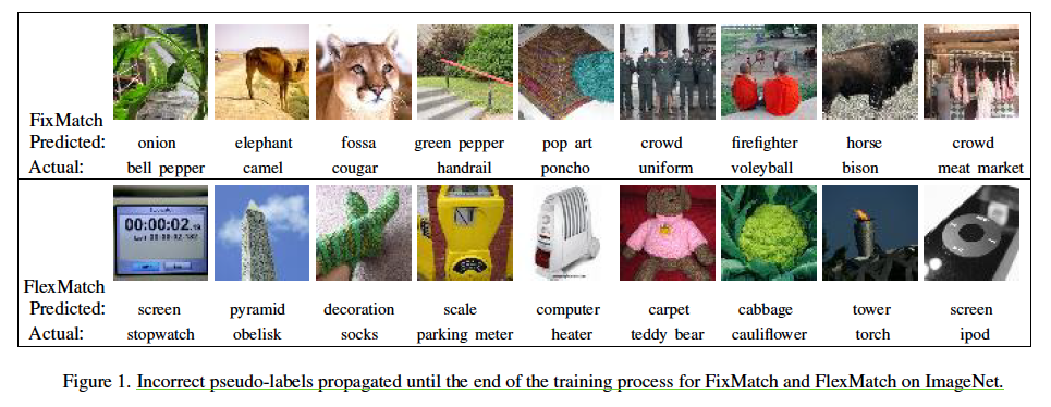 결국 기존 두 방법론은 Pseudo-label 뽑고 학습에 사용 여부를 결정하는 기준이 달라졌다는 차이가 있다고 정리할 수 있겠네요. 그렇다면 저자가 생각하는 문제점은 무엇일까요? 바로 pseudo-label을 뽑을 그 때의 모델 상태만을 고려한다는 점입니다. 저자의 말에 따르면.. 앞서 반복적으로 학습해오면서 보인 모델의 상태를 고려하지 않고, 가장 마지막 모델의 output만을 사용한다면 ‘근시안적인’ 관점만을 제공하기 때문에 정보가 충분하지 않다고 합니다. 또한 over-confidence 라고 모델이 틀렸음에도 불구하고 높은 확신도를 가지고 있어 오히려 pseudo-label이 실제 GT와 달라서, 모델 학습에 악 영향을 미치는 경우가 발생하기도 합니다. 아래 그림이 바로 FixMatch와 FlexMatch 모두에 대해 잘못된 pseudo-label을 사용하여 학습에 사용되는 예시입니다.