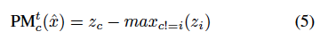 우선 Margin이라는 지표는 할당된 기준값 레이블에 해당하는 logit과 가장 큰 다른 logit 사이의 차이를 정량화하는 지표입니다. 즉, 이 지표를 통해 그동안 학습하면서 얼마나 예측값의 변동이 있는지를 정량화하여 나타낸 것이라 할 수 있습니다. 그런데 Semi-SL에서는 unlabeled 에 대한 기준값인 GT를 사용할 수 없습니다. 따라서 저자는 GT가 아닌 Pseudo-label을 기준점으로 사용하고자 하였고 이를 Pseudo-Margin (PM) 으로 재정의하였습니다. c를 pseudo-label(예측값의 최대값)이라고 하면, 이제 c에 대한 \hat{x}의 값은 다음과 같이 iteration t에서 계산할 수 있습니다.