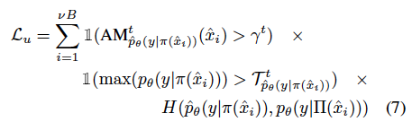 (아래 수식에서 FixMatch의 confidence 부분이 AM으로 대체된 걸 확인할 수 있죠? \gamma^t는 학습 t번째에서의 APM임계값입니다. 이건 아래 섹션에서 어떻게 결정하는지 추가로 설명합니다.)