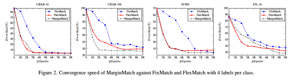 사실 Semi-sueprvised 에서 비교하는 실험은 또 아래와 같이 얼마나 빨리 수렴하느냐, 에 대한 지표도 제시하였습니다. 그 결과는 아래와 같은데요. 클래스 당 4개의 레이블이 있는 모든 데이터셋에서 MarginMatch가 FlexMatch와 비슷한 수렴 속도를 보이고, 동일한 계싼 비용으로 ResNet-50을 사용하는 다른 SSL 방법보다 성능이 뛰어나다고.. 합니다.
