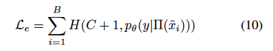 E의 예시는 원래 클래스 C 중 하나에 속해야 하기 때문에, 존재하지 않는 새로운 클래스 C+1에 할당되면 레이블이 잘못 지정된 것입니다. 모든 U unlabeled 데이터 샘플과 마찬가지로 E의 잘못된 라벨이라는 특별히 생성한 class에 대해 APM^t_{C+1}를 계산하지만, U의 라벨이 없는 샘플과 달리 E의 샘플들은 고정된 C+1이라는 클래스를 갖게 됩니다. U에서 라벨이 없는 샘플의 학습 과정을 모방하기 위해 strong aug.를 사용하여 E에서 잘못된 샘플의 loss를 계산하게 됩니다. 즉, B의 잘못된 샘플 배치가 주어졌을 대의 loss는 다음과 같습니다.