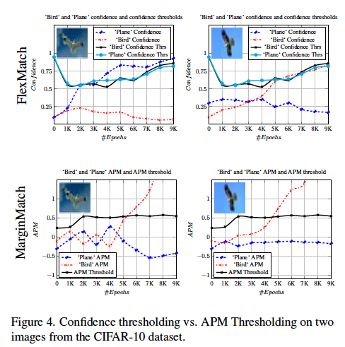 Margin Match 효과에 대한 정성적 결과인데요. 배경이 유사한 두 개의 새 이미지에서 위쪽은 새와 plane 클래스에 대한 신뢰도 및 FlexMatch의 임계값의 진행상황을 보여주고, 아래쪽은 APM과 함께 MarginMatch의 APM 임계값의 진행상황을 보여주었습니다. 그 결과 오른쪽 이미지에서 MarginMatch의 경우 학습이 진행됨에 따라 새 클래스에 대한 APM이 점점 강해지는 것을 확인할 수 있었다고 합니다.