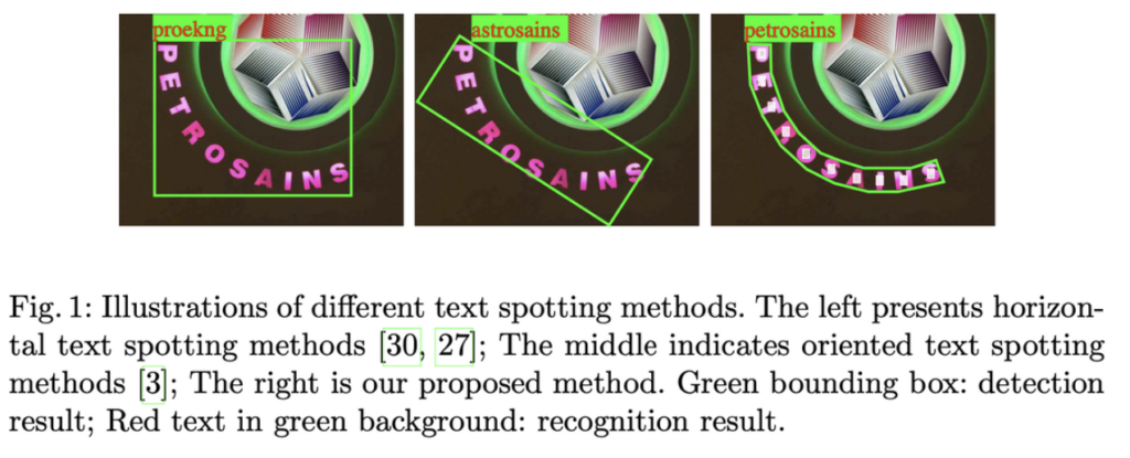 [Fig1]은 다른 textspotting 방법론과 mask textspotter를 비교한 것인데, 왼쪽 방법론은 수평적인 bbox만 그릴 수 있는 horizontal text spotting method이고, 가운데는 oriented text spotting 방법론입니다. 마지막으로 오른쪽이 본 논문에서 제안한 mask textspotter로 앞의 두 방법론에 비해 recognition 결과가 정확한 것을 확인할 수 있습니다.