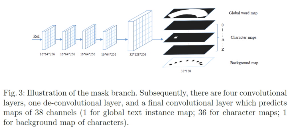 위 그림이 mask branch를 도식화 해논 것인데, 보시면 16×64로 크기를 고정한 RoI를 4개의 convoluton layer와 deconvolution layer를 통해 38개의 map(32 x 128 크기)을 예측하게 됩니다. 38개의 map이 어떻게 구성되어 있는지 알아보자면,, 먼저 한 개의 global text instnace map과 36개의 character map 그리고 마지막으로 한 개의 character의 brackground map으로 구성되어 있습니다. global text instance map은 text 영역에 대한 정확한 위치를 제공하며 그림 우상단을 보시면 [Fig2]에서 봤던 input 이미지에 있던 무지개 모양의 text의 위치를 그대로 담고 있는 map인 것을 알 수 있습니다. 또, character map은 36개라고 했었는데 이는 26개의 알파벳(A to Z)과 10개의 숫자(0 to 9)로 이루어져 있습니다. 마지막 map인 character의 background map은 후처리 과정에서 사용되게 되는데 이는 뒤에서 다시 언급하도록 하겠습니다.