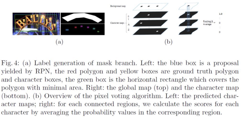 말을 조금 어렵게 한 것 같은데 위 그림 (b)부분이 pixel voting 알고리즘을 나타낸 것입니다. 왼쪽에 있는 4개의 map이 mask branch단에서 예측한 chracter map에 해당합니다. 실제로는 37개의 map으로 구성되어 있겠죠. 오른쪽에 있는 것은 background map을 이진맵으로 만들고 연결되어 있는 것들을 한 region이라고 보았을 때, 각 character map에서 이 영역에 해당하는 pixel값들의 평균을 계산함으로써 높은 값을 가지는 character map의 class를 할당하는 것입니다.