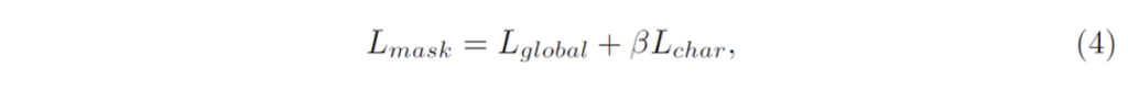 mask branch에 대한 loss는 아래와 같이 global text instance segmentation loss(L{global}와, character segmentation loss(L_{char})두 loss의 합으로 구성됩니다.