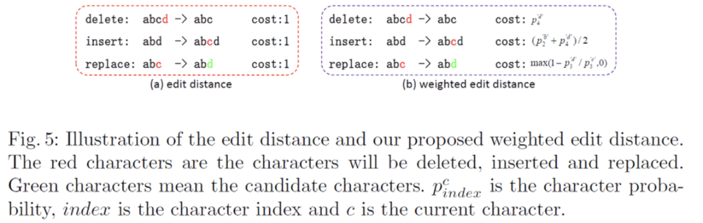 ocr dataset에서는 lexicon(dataset에 대한 단어 사전)을 제공하는 경우가 있습니다. Edit distance, 즉 편집 거리는 주어진 lexicon과 예측된 sequence 사이에서 잘 맞는(best – matchied) 단어를 찾는데 사용됩니다. 여기서 편집 거리라는 것은 두 문자열이 주어졌을 때 얼마나 유사한 지 알아낼 수 있는 알고리즘으로써 두 문자열이 같아지기 위해 몇 번의 추가(insert), 편집(replace), 삭제(delete)가 이뤄져야 하는지 최소 개수를 구하는 것입니다. 하지만, minimal 편집 거리를 갖는 단어가 여러 개 있는 경우에는 어떤 단어가 최적의 단어인지 판단하기 어려울 수 있겠죠. 이런 문제의 주된 원인으로는,, 기존 eidt distance 알고리즘의 모든 operation(delete, insert, replace)가 동일한 cost를 가지기 때문에 실제로 의미가 없다는 점입니다.