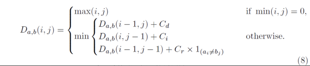 위 식에서 1_{(a_i ≠ b_j)}는 a_i와 b_j가 같으면 0이고, 같지 않으면 1인 함수를 의미합니다. D_{a,b}(i, j)는 문자열 a의 앞에서부터 i개 문자와 문자열 b의 앞에서부터 j개 문자 사이의 거리를 나타냅니다. 일반적인 edit distance에서는 delete cost, insert cost, replace cost가 다 1입니다.