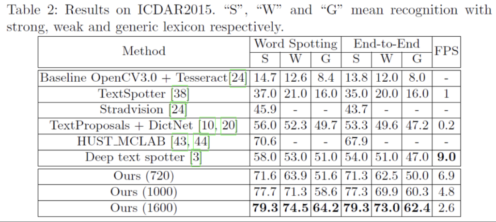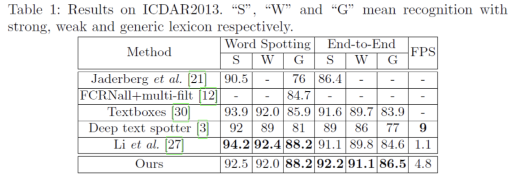 표에 보이는 S, W, G는 각각 Strong, Weak, Generic입니다. ICDAR2013 dataset은 lexicon(단어 사전)을 제공하는 데이터셋인데, 이 lexicon을 구성하는 단어 수에 따라 S, W, G가 구분되게 됩니다. Strong은 이미지당 100개의 단어를 제공하며 이미지에 나타나는 모든 단어를 포함한 사전이며, Weak는 전체 test set에 있는 모든 단어가 포함되어 있습니다. 마지막으로 Generic은 9만개의 단어를 가지고 있습니다.