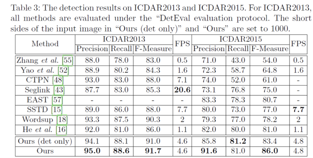 ICDAR2013 dataset을 가지고 실험 결과를 보시면, End-to-End 단에서 SOTA를 달성한 것을 볼 수 있습니다. 이는 horizontal text만 포함한 dataset에 대한 성능에서 SOTA를 달성하였다고 보면 되겠습니다.