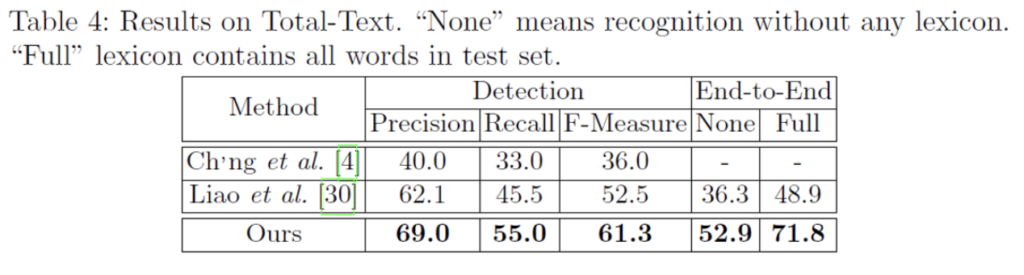 [Table3]은 detection 성능만을 측정한 것인데 보시면 [18],[16]은 multi-scale로 수행되었음에도 불구하고 single scale인 mask textspotter(ours)가 성능이 더 높은 것을 확인할 수 있습니다. (F measure: 91.7% vs 90.3%)