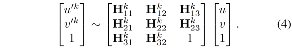 저자는 먼저 사전에 계산된 초기 8개의 homography bases를 만드는 과정에 대해서 설명을 하는데, identity homography matrix의 single element(e.g., h_{11} , h_{22] )들을 수정하여 8개의 호모그래피 행렬을 만든다음 이들을 영상 좌표에 적용하여 flow map을 생성합니다.