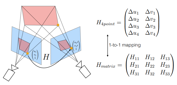 오히려 호모그래피의 8개의 원소들 값 간에는 scale이 다들 상이하기도 하고 일관성이 없기에 학습이 어려운 반면, 영상의 offset의 경우에는 픽셀 단위로 그 스케일 값이 그리 크지가 않아서 offset 방식으로 학습하는 것이 보다 학습이 더 잘된다고 합니다. 아무튼 이렇게 offset을 계산하게 되면 둘 사이에 대응점 4쌍을 구할 수 있게 되고 이 값들에 대하여 방정식을 풀어나감으로써 최종적인 호모그래피를 추정하게 됩니다.