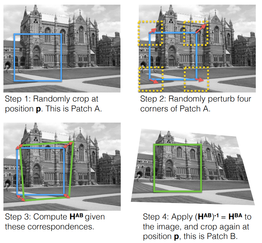 그래서 기존의 지도학습 기반 연구들은 그림2와 같이 하나의 이미지에 대하여 패치를 지정하고, 해당 패치의 각 코너에 랜덤한 offset을 적용 및 homography 연산을 수행하여 source region과 target region 구하는 합성 데이터 생성 방식으로 학습을 수행합니다.