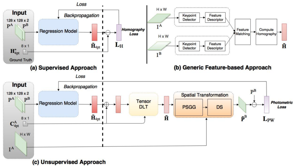 이러한 딥러닝 기반의 호모그래피 추정 방식은 크게 지도학습 방식과 비지도학습 방식으로 나눌 수 있습니다. 지도학습 방식은 당연히 학습 때 GT값이 존재한다는 의미인데, 사실 두 영상간에 대응점에 대한 GT를 구하는 것은 상당히 번거롭고 귀찮은 일에 해당합니다.