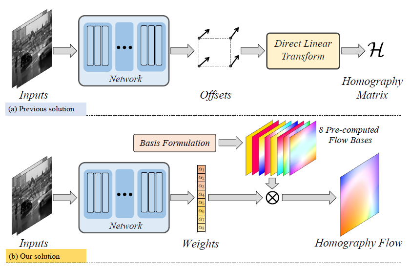 보시면 두 입력 영상을 넣어 네트워크로부터 offset을 계산하도록 하는 것이 아닌 8개의 가중치값을 추론하도록 시킵니다. 이렇게 추정된 가중치들은 초기에 미리 계산해둔 8개의 Flow bases에 weighted sum을 함으로써 최종적으로 Homogrpahy를 추정하게 됩니다. 이러한 flow based homography 방식은 특히나 두 영상이 small-baseline일 때 매우 효과적으로 동작할 수 있다고 합니다.