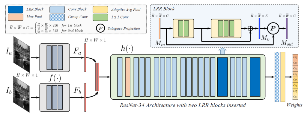 그리고 호모그래피 추정 네트워크에 뒷부분에서 LRR block이 2개 존재하게 되는데 이 LRR block은 shallow한 residual block 으로 구성이 되어 있습니다. 해당 블록의 최종적인 역할은 입력된 motion feature의 high rank를 잘 추려서 low rank로 projection하는 역할을 수행합니다.