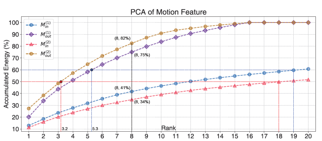 Motion feature가 어떠한 경향성을 나타내고 있는지를 PCA 기법을 통해서 확인해보고자 해당 그래프가 나타난 것이지 실제 학습 및 추론 단계에서 PCA를 사용하지 않는다는 점을 말씀드리고 싶습니다.