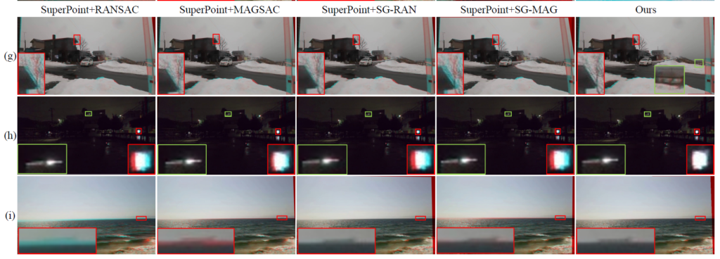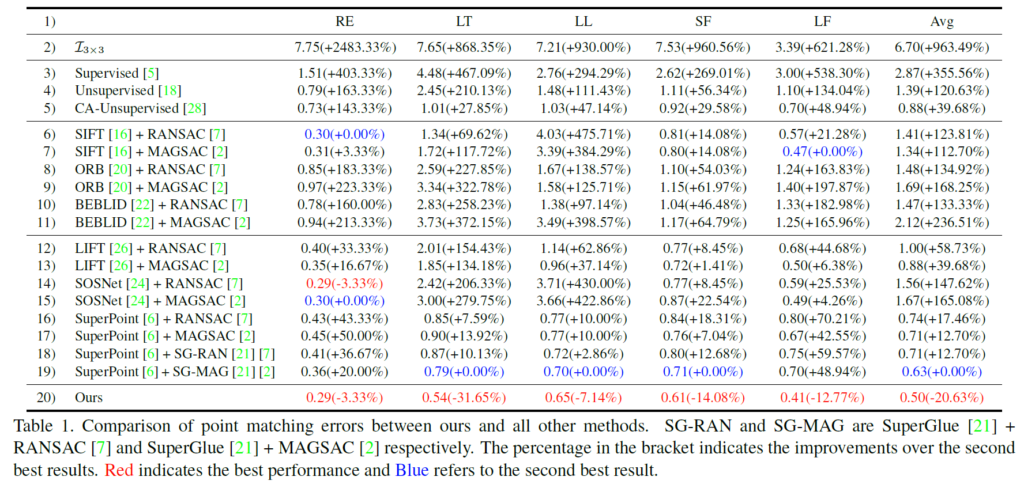 위에 표 1은 deep learning based, feature based 그리고 제안하는 방법론에 대한 비교 성능을 보여주는 표입니다. 평가 지표는 대응점들에 대한 L2 distance의 평균을 계산한 것이며, RE, LT, LL SF, LF는 각각 REgular, Low-Texture, Low Light, Small Foregrounds, Large-Foregrounds로 구분을 짓는다고 합니다. 즉 앞에 Regular가 가장 쉬운 케이스에 속하고 그 외에 나머지들은 대응관계를 계산하기 힘든 각 특징별 어려운 장면들이라고 보시면 될 것 같습니다.