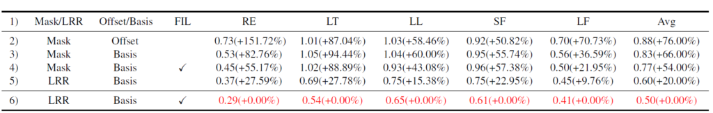 아무래도 Masking 방식은 3개 정도의 매우 얕은 컨볼루션 레이어로 입력 영상들에서부터 outlier region을 찾아야하다보니 small foreground 혹은 low light 등 영상 내 정보들을 쉽게 특정하기 힘든 경우 부정확한 마스크가 추출되는 반면, LRR 모듈은 feature의 rank를 줄인다는 컨셉으로 접근하게 되니 보다 좋은 성능을 기대할 수 있었던 것 같습니다.