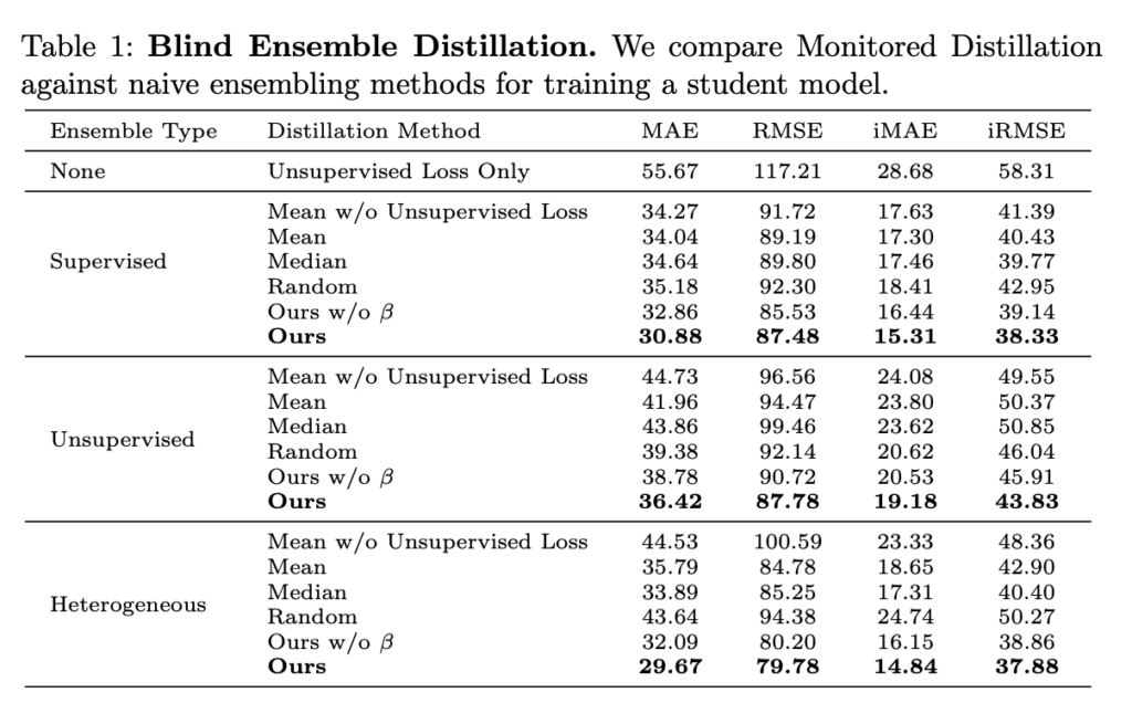 Tab 1에서는 해당 블라인드 앙상블 기법의 범용성을 입증하기 위해 지도학습/비지도/Heterogeneous 기반의 teacher 모델을 이용하여 수행한 결과를 보이며, 어느 방법에서도 높은 결과를 보여줍니다. 또한 나이브한 앙상블 기법 mean/median/random을 이용한 결과 대비 높은 결과를 보여줍니다. 또한 scale 정보가 부여된 β를 사용한 경우에 MAE 기준 2~3 성능 향상을 보여줍니다.