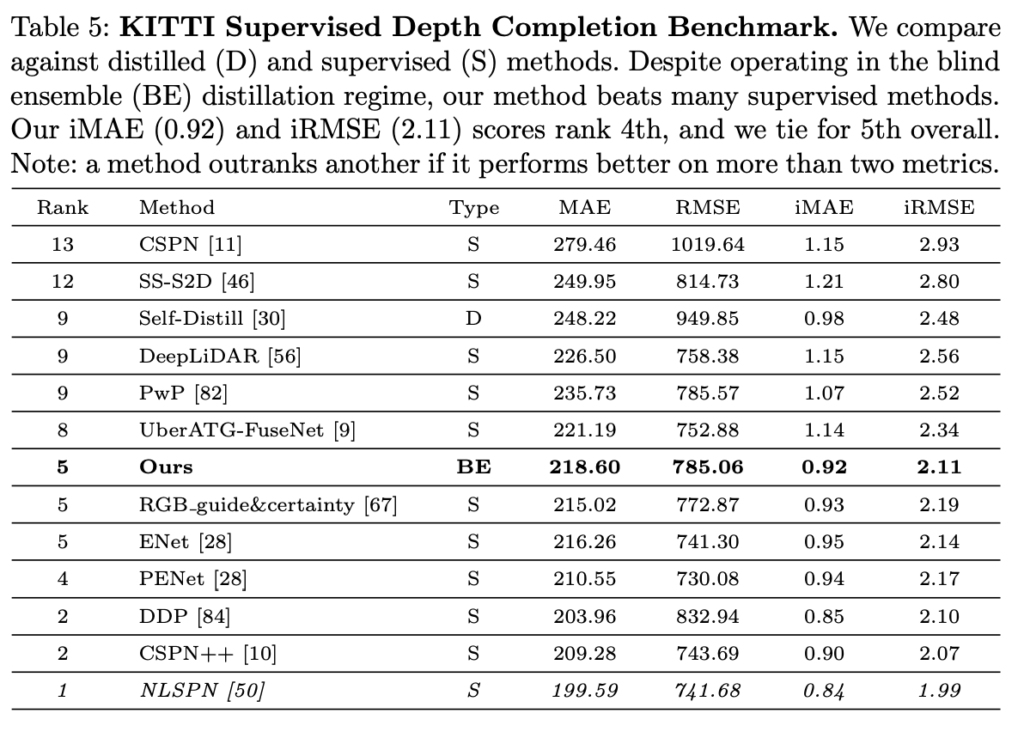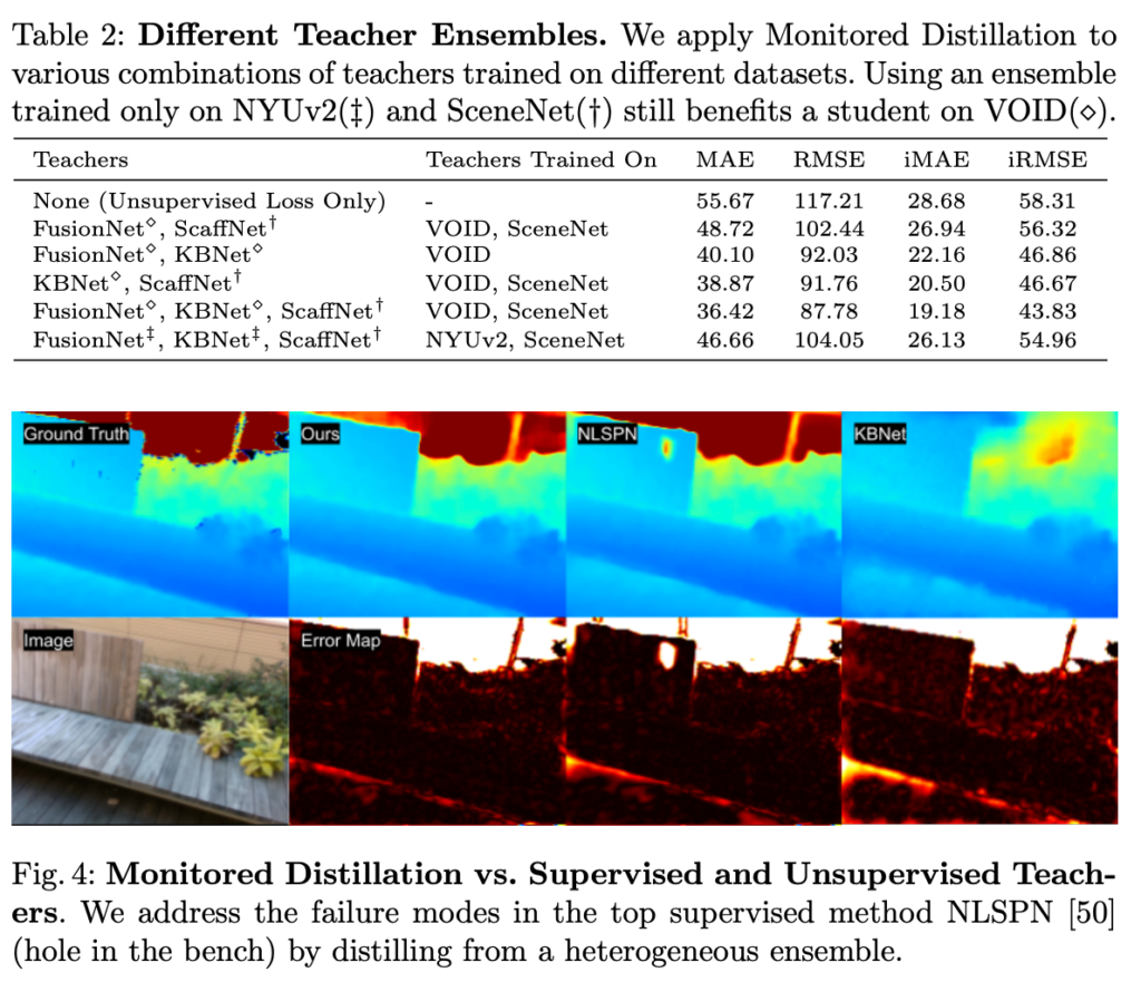 해당 논문은 이전 리뷰에서 다룬 KBNet과 동일하게 단일 영상과 sparse point cloud 그리고 calibration K를 입력으로 dense depth map을 추론하는 방법을 사용합니다. 다만, 다른 특성을 보는 기존 모델(teacher) 특성들을 활용하여 더 높은 성능을 보이기 위해 knowledge distillation을 해당 태스크의 특성에 맞춘 방법을 소개합니다. 보다 구체적으로 설명하자면 다음과 같습니다. Depth map을 생성하는 기존 모델을 활용하기 위해, student 모델이 teacher의 error를 학습하지 않도록 하는 positive congruent training process를 생성하는 adaptive knowledge distillation을 제안합니다. 좋은 결과를 가진 모델 선별하거나 학습을 위한 GT가 없는 경우,Monitored Distillation라고 하는 이 방법을 사용하면 student model은 주어진 이미지의 reconstruction error를 가장 최소화하는 예측을 선택적으로 학습하여 teacher model들의 blind ensemble을 활용할 수 있습니다. Monitored Distillation는 특정 teacher model의 예측이 관찰된 이미지와 얼마나 잘 일치하는지에 대한 distilled depth map과 confidence map, 즉 ‘monitor’를 생성합니다. Monitor는 distilled depth에 적응적으로 가중치를 부여하는데, 모든 teacher가 high residuals를 보이는 경우에는 기존 unsupervised image reconstruction loss이 supervisory signal로 사용됩니다. 실내 환경(VOID)에서는 블라인드 앙상블 기준선 대비 17.53%, 비지도 방식 대비 24.25% 더 나은 성능을 보이며, 최고 성능의 지도 방식과 비슷한 성능을 유지하면서 79%의 모델 크기 감소를 보입니다. 실외(KITTI)의 경우, GT를 사용하지 않았음에도 불구하고 벤치마크 전체에서 공동 5위를 차지했습니다.