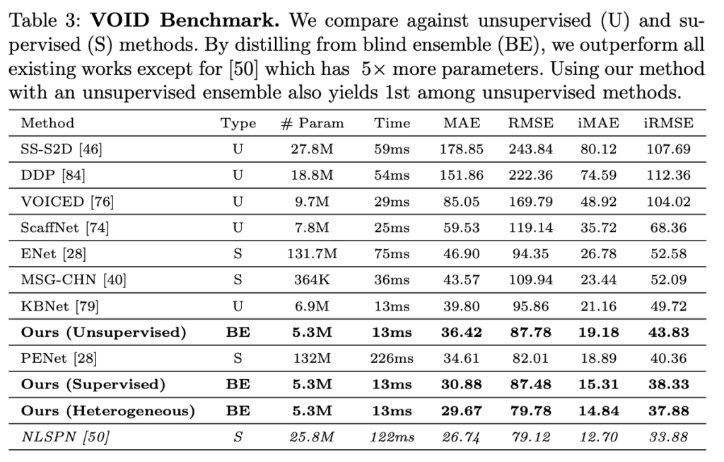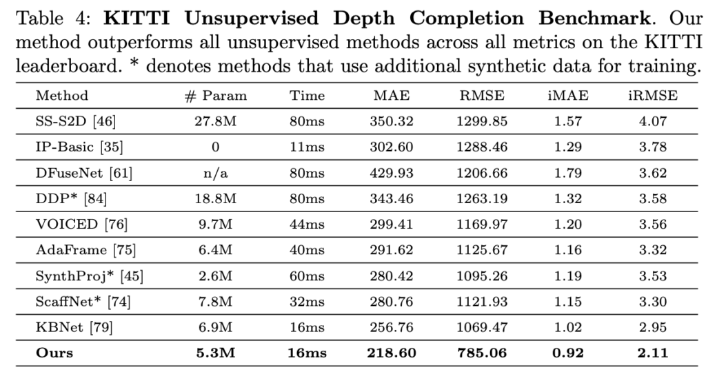 Tab 3-5에서는 Depth completion 태스크에서 가장 알려진 VOID, KITTI에서 성능 평가를 보였고, 표와 같이 지도 학습와 비교 했을 때도 좋은 결과를 보여주고 있습니다.