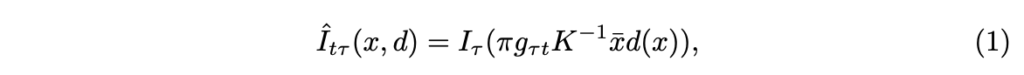 여기서 x 는 depth map의 한 값을 나타내고, x에 대한 homogeneous coordinate \bar{x} = \[x^{\top} \ 1 \]^{\top}를 나타냅니다. g_{\tau t} \in SE(3) 는 시점 t에 대한 상대적 카메라 포즈, K는 내부 카메라 파라미터를 나타냅니다. \pi 는 perspective projection을 의미합니다. g_{\tau t} 는 스테레오인 경우 camera baseline으로부터 도출하거나, Visual odometry를 통해 추론하거나, 비디오 뷰를 pose network를 통해 학습하여 추론하여 사용합니다.