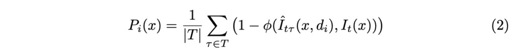 각 teacher h_i 에 대해 I_t 과 재구성 영상 \hat{I}_{t\tau}(x, d_i), \tau \ in T 사이의 SSIM를 통해 photometric reprojection error P_i 를 측정합니다. 이는 아래와 같습니다.