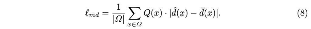 여기서 \lambda 는 temperature parameter에 해당합니다. Q는 자연스럽게 높은 신뢰도를 가진 distilled depth 맵에서 높은 점수를 가지게 됩니다. 이는 student model의 예측 값과 distilled depth 간의 지도 학습에 사용됩니다. 최종적인 monitored knowledge distillation loss는 아래와 같이 구성됩니다.