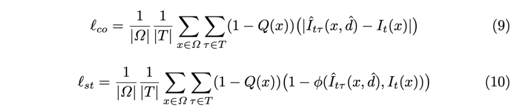 앞에서 언급한 바와 같이 Q를 이용하여 높은 reconstruction error이 발생한 경우에는 비지도 학습 기반의 손실 함수를 이용한 학습을 진행합니다. 해당 태스크에서는 일반적으로 unsupervised photometric reprojection error (i.e. color and structural consistencies)를 이용합니다. 이는 아래와 같습니다.