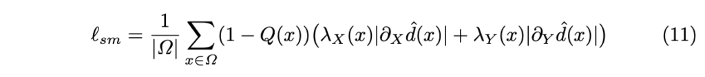 여기서 \partial_X, \partial_Y 는 x와 y 방향에 대한 미분, 가중치 \lambda_X := e^{- \| \partial_X I_t(x)\|} ~ \lambda_Y := e^{- \| \partial_Y I_t(y)\|} 에 해당합니다.