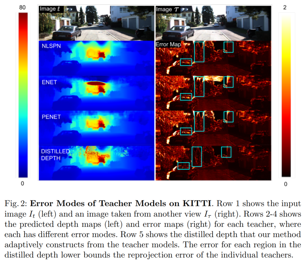 보정된 이미지 I와 이미지 평면에 투영된 sparse point cloud z에서 3차원 장면을 복구하는 것을 목표로 합니다. 이를 위해 I, z 그리고 카메라 고유 파라미터 k를 입력으로 받아 dense depth map d를 출력하는 함수 f_{\theta}를 학습하는 것을 제안합니다. 시점 t에서 촬영된 동기화된 영상과 sparse depth map \( I_t, z_t \) 의 각 쌍에 대해 공간적/시간적 인접한 시점 T의 영상 쌍을 이용할 수 있다고 가정합니다. 또한, M개의 모델 or “teachers” \{ h_i \}_{i=1}^M (e.g. 공개된 사전 학습 모델)을 이용할 수 있다고 가정합니다. fig 2에서는 각 teacher 마다 고유한 error mode가 존재함을 볼 수 있습니다. 이러한 특성을 활용하기 위해 모델을 선별하기 위한 모델의 성능을 평가할 수 있는 지표가 부족하다는 문제가 있습니다. 저자는 이 문제를 해결하기 위해 ensemble learning을 위한 adaptive knowledge distillation framework인 “Monitored Distillation”을 제안하여 결과적으로 positive congruent training 유도합니다. 즉, teacher 모델의 예측이 다른 뷰 시점과 어느 정도 일치하는 경우에만 학습에 사용하는 방식을 사용하는 것을 목표로 합니다. (~=positive congruent training)