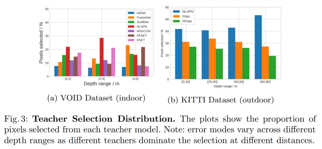 fig 1에서는 전반적인 파이프라인을 볼 수 있으며, fig 3에서는 distilled depth를 구성하기 위해 선택된 teacher에 대한 분포를 보여줍니다. 보이는 바와 같이 서로 다른 교사들은 서로 다른 depth range에 걸쳐 서로 다른 영역에서 좋은 성과를 보입니다. 저자는 제안한 방법을 통해 각 교사로부터 가장 낮은 오차를 가진 포인트~픽셀을 선택하여 adaptive ensemble을 생성할 수 있다고 합니다.