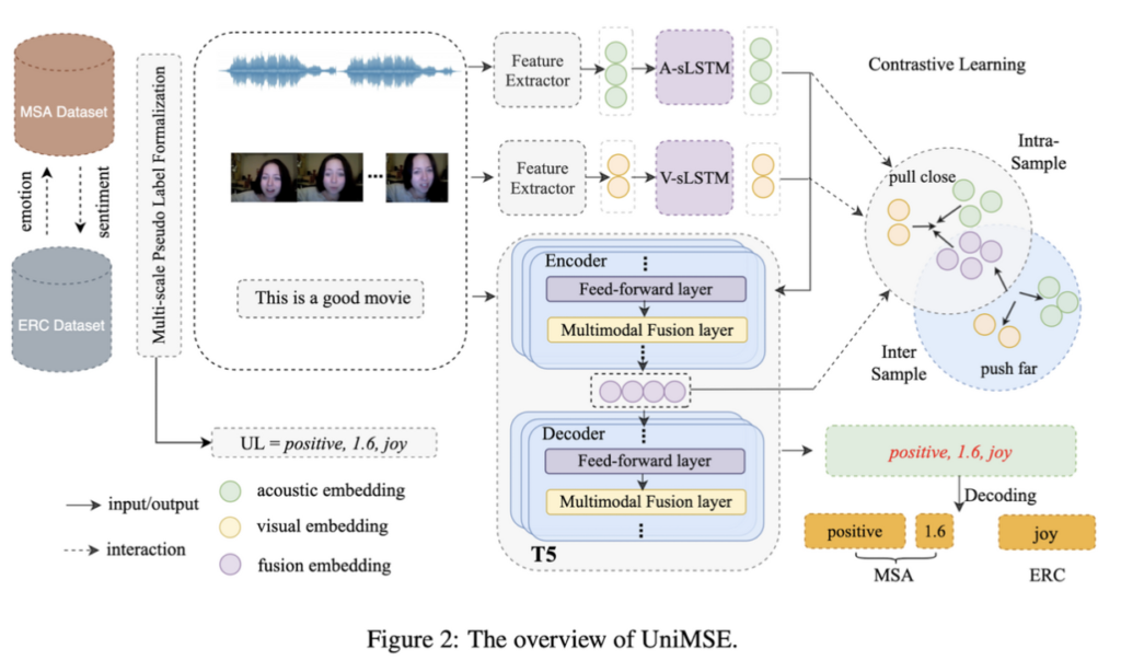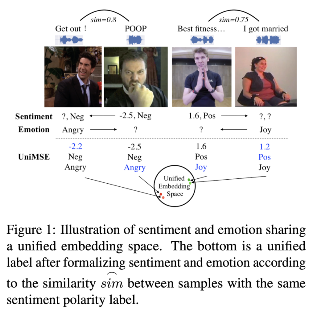 - We propose a multimodal sentiment- knowledge sharing framework2 (UniMSE) that unifies MSA and ERC tasks. The proposed method exploits the similarities and complementaries between sentiments and emotions for better prediction.