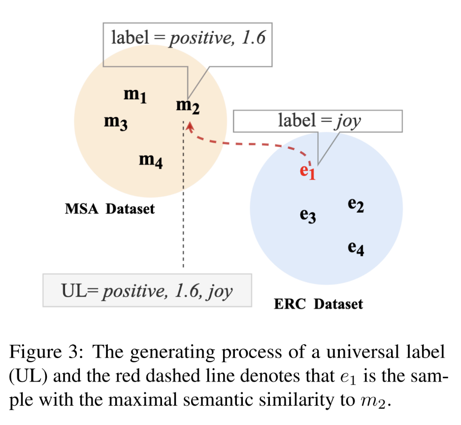 처음으로, 먼저 sentiment polarity에 따라 MSA와 ERC의 sample을 positive, neutral, negative sample set으로 분류합니다. 그런다음 같은 sentiment polarity이지만 다른 annotation scheme에 속하는 두개의 sample간의 유사도를 계산하여 universal label에서 missing된 part를 완성합니다. 이렇게 말로만 설명 들으면 이해가 잘 가지 않는데요. Figure 3를 통해서 예를 확인할 수 있습니다. MSA sample m_2가 주어진다고 해봅시다. 이 sample은 positive sentiment와 1.6의 annotation score를 가지고 있습니다. m_2에는 emotion category label이 없는데요. 이 예에서는 m_2와 semantic similarity가 가장 높은 e_1를 선택한 다음, e_1의 emotion category를 m_2의 emotion category로 할당합니다.