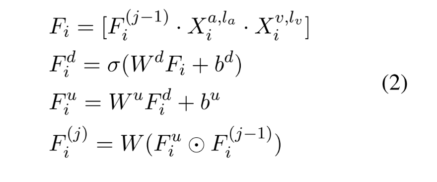 여기에서 X_i^{a,l_a} \in R^{l\times{d_a}}와 X_i^{v,l_v} \in R^{l\times{d_v}}는 X_i^a와 X_i^v의 마지막 time step의 hidden state를 의미합니다. X_i^a와 X_i^v는 두개의 각각의 LSTM으로 인코딩된 acoustic, visual modality representation을 의미합니다. [\dot]은 feature dim에서 concat operation을 의미하고, σ는 sigmoid를 의미합니다. {W^d, W^u, W, b^d, b^u}는 learnable parameter를 의미합니다.