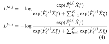 여기서 L^{ta, j}와 L^{tv,j}는 encoder의 j번째 Transformer layer에서 수행되는 text-acoustic, text-visual의 contrastive loss를 나타냅니다.
