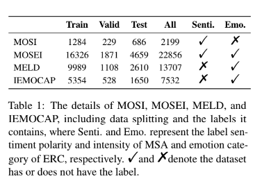 본 논문에서는 멀티모달 감정인식 논문에서 한번 봤다 하는 데이터셋을 모두 사용하였는데요. 아래와 같이 사용하였습니다.