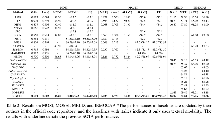 - Experimental results demonstrate that UniMSE achieves a new state-of-the-art performance on four public benchmark datasets, MOSI, MOSEI, MELD and IEMOCAP, for MSA and ERC tasks.