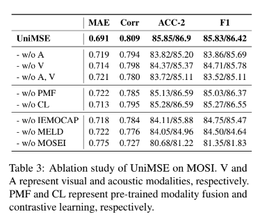 본 논문에서는 MOSI에서 ablation study를 진행했는데요. 우선 먼저 여러개 modality를 사용한 것에서 modality 하나를 제거하거나 하나만 사용한다거나 하는 식으로 실험을 수행하였는데요. 표에서 볼 수 있듯이 visual modality를 제거하거나 acoustic modality를 제거하거나 모두 제거하면 성능이 저하되는 것을 확인할 수 있고, 이를 통해서 비언어적 신호(시각, 청각을 말합니다)가 MSA task를 해결하는 것에 필요하고 text, acoustic, visual modality가 상호 보완적이라는 것을 확인할 수 있습니다.