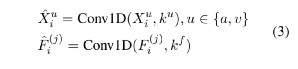 F^{(j)}_i는 j Transformer layer 후에 얻는 값인데요. k^u (u ∈ {a, v})는 modality u에 대한 convolutional kernel의 크기를 의미하고, k^f는 fusion modality에 대한 convolutional kernel의 크기를 나타냅니다.