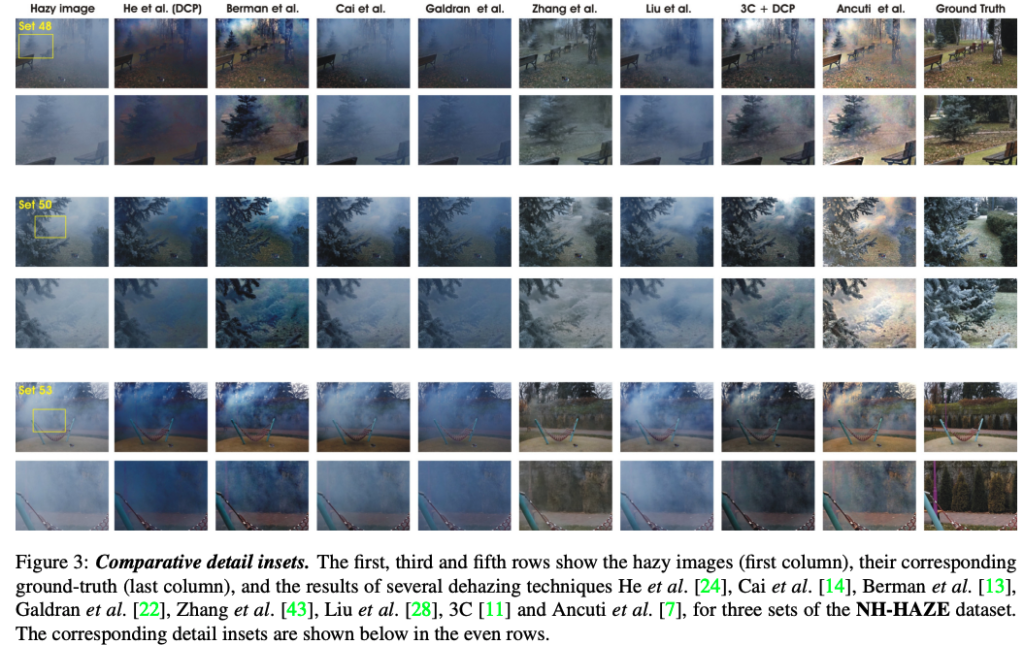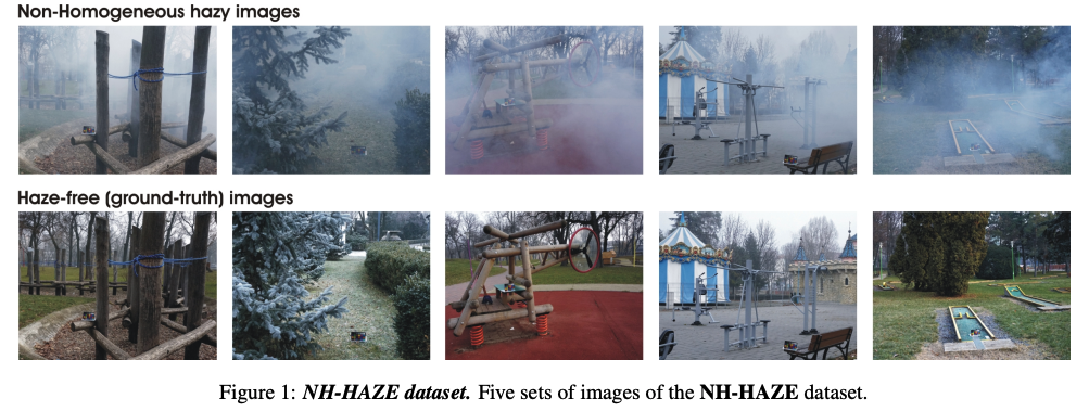 저자는 전문? 연무 생성기를 이용하여 비균일한 연무를 포함한 실제 연무 장면을 생성한 최초의 실제 이미지 디헤이징 데이터 셋 NH-HAZE를 제안하며 해당 데이터 셋은 야외에서 촬영한 55쌍의 영상을 포함하며, SOTA를 달성한 단일 이미지 디헤이징 기법들로 벤치마크를 보여줍니다.