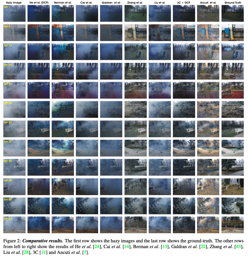 로컬하게 airlight를 추정하는 Ancuti et al.의 방법은 높은 콘트라스트와 선명한 색상을 생성하지만, 이 이미지 세트에 약간의 노란빛이 도는 색상 이동을 유발하는 경향이 있습니다. Cai et al.과 Liu et al의 CNN 기반 기법은 영상 전반이 균일하게 흐릿하다는 가정을 가진 전략으로 인해 흐린 영역의 대비를 복원하는 데 한계가 있습니다. 반면에 Zhang et al.의 CNN 방법은 장면의 헤이즈 변화를 더 잘 처리하는 것을 토대로 우리는 CNN 기반 방법이 큰 잠재력을 가지고 있으며 일반적으로 다른 기술 대비 보다 나은 발전을 보일 것으로 기대한다고 이야기 합니다..비 CNN 기법은 CNN 기반 기법에 비해 색상 왜곡이 더 심하며 일반적으로 결과물이 부자연스럽게 보이는 경향이 있습니다. 색상 이동 외에도 구조적 아티팩트와 초기 노이즈를 증폭시키는 경향이 있습니다.