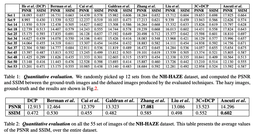 또한 저자는 연무가 없는 영상을 기반으로 객관적인 정량적 평가를 수행합니다. tab 1은 fig 2에 표시된 이미지에 대해 다양한 디헤징 기법의 결과물을 PSNR 및 SSIM에 기반한 실사(헤이즈 없는) 이미지와 비교한 것입니다. Structural Similarity index(SSIM)는 휘도 및 콘트라스트에 대해 정규화된 픽셀 강도의 로컬 패턴을 비교하여 측정합니다. SSIM의 범위는 [-1,1]이며, 두 개의 동일한 이미지에 대해 최대값은 1입니다. tab 2에는 NH-HAZE 데이터 세트의 전체 55개 장면에 대한 평균 SSIM 및 PSNR 값이 나와 있습니다. 이 표를 통해 구조 및 색상 복원 측면에서 Zhang et al과 Ancuti et al의 방법이 SSIM 및 PSNR 측정값을 고려할 때 평균적으로 가장 우수한 성능을 보이며, 정성적인 결과 또한 시각적인 측면과 색감적인 측면에서 다른 방법론 대비 좋은 결과를 보여주고 있습니다.