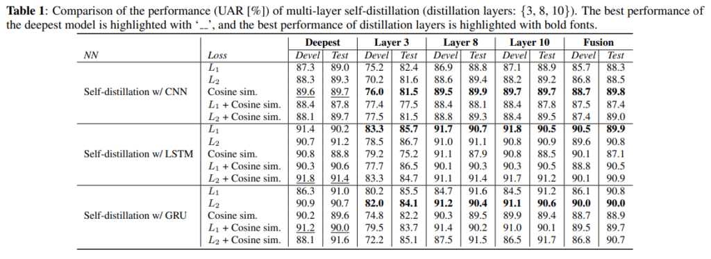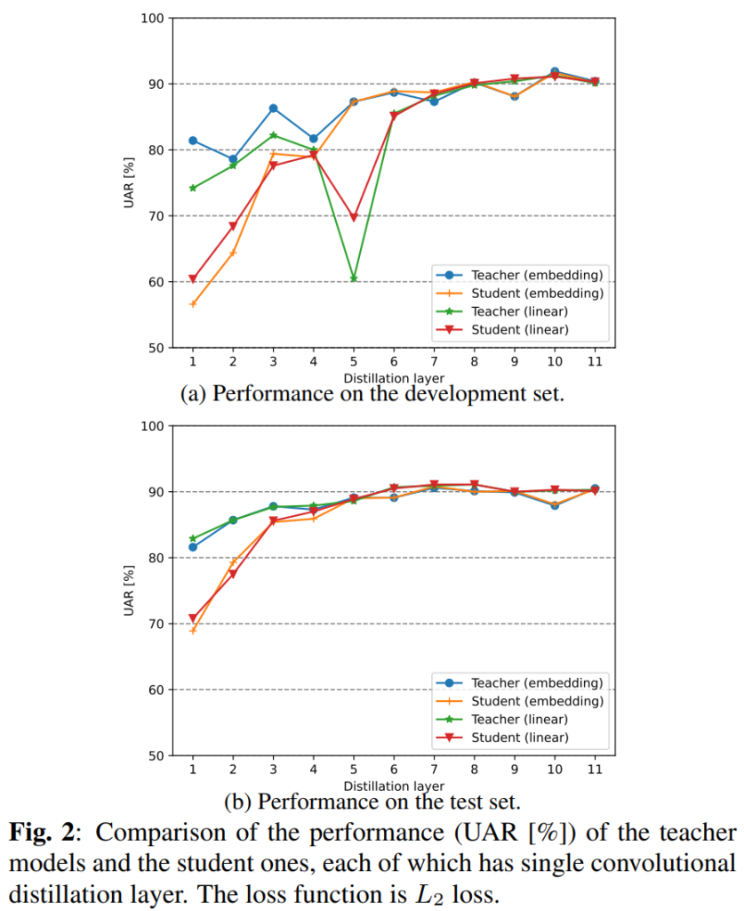 [그림 2]는 self-distilation 성능을 distilation 레이어에 따라 나타낸 것입니다. 위의 [DEMoS 데이터셋 분포]를 보면 데이터를 train, dev, test 세 종류로 나눈 것을 확인할 수 있는데요, [그림2-(a)]는 dev set으로 평가하였고 (b)는 test set으로 평가한 결과인데요, (a)는 train set 만을 학습에 사용하였고, (b)는 train+dev set을 모두 학습에 사용한 뒤 평가한 결과라고 합니다. 그림에서 보실 수 있는 것처럼 더 깊은 레이어에서 더 높은 성능을 보여주고 있으며, 이는 얕은 레이어보다 깊은 레이어가 오디오 전체의 추상적인 표현을 더 잘 학습할 수 있기 때문이라고 합니다. 또한 대체적으로 Teacher가 student보다 높은 성능을 보이지만 7번째 레이어 이후부터는 student의 성능이 teacher의 성능과 비슷해지는 것을 확인할 수 있습니다.