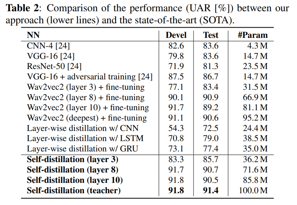 그러나 저자들은 대규모 모델을 fine tuning하는 방식은 memory space의 사용량이 크고 느린 inference time을 보인다는 점을 문제라고 지적하며 이를 개선하기 위해 self-distilation을 음성 감정인식 모델에 적용하였습니다.