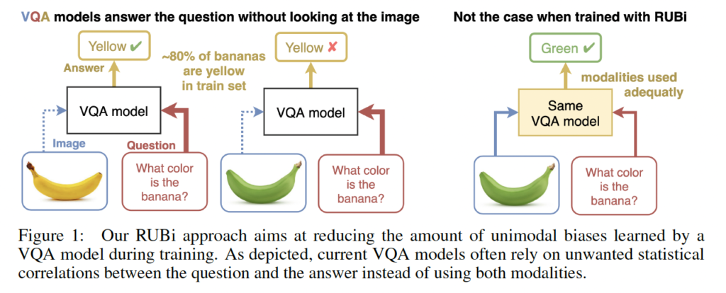 이 논문이 2019년도 논문이니 2019년도 정도에 large real image VQA dataset이 등장했다고 합니다. 데이터셋의 각각은 VQA 모델이 fine-graned recognition, object detection, counting, activity recognition과 같은 real-word setting에서 사용되어야 하는 specific ablities를 target으로 하였는데요. 이 덕분에 end-to-end VQA 모델이 대부분의 benchmark에서 인상적인 결과를 달성하였고, 심지어 compositional reasoning도 고려한 특정 benchmark에서 사람의 정확도를 능가하였다고 합니다. 그런데 이렇게만 잘 동작되면 이 논문이 나왔을리는 없죠? 문제가 있으니 이 논문이 나왔겠죠. 그 문제는 VQA 모델이 answer occurrence와 question의 특정 패턴 사이의 statistcal regularities를 악용하는 경향이 있다는 것을 발견한 것입니다. 모델 설계는 두 모달리티의 정보를 merge 하도록 설계가 되었지만, 실제로는 image 모달리티를 고려하지 않고 대답하는 경우가 많았다고 합니다. 대부분의 바나나가 노란색인 경우 모델은 바나나의 색을 묻는 질문에 대해 높은 정확도를 달성하기 위해서 굳이 image 모달리티 사용하여 학습할 필요가 없습니다. 이미지를 보고 바나나를 감지하고 색깔을 평가하는 대신, 가장 많이 발생하는 답변인 노란색으로 ‘what’, ‘color’, ‘bananas’ 단어를 연결하는 statistical shortcut을 통해 학습하는 것이 모델 입장에서는 훨씬 쉬운 것이지요.