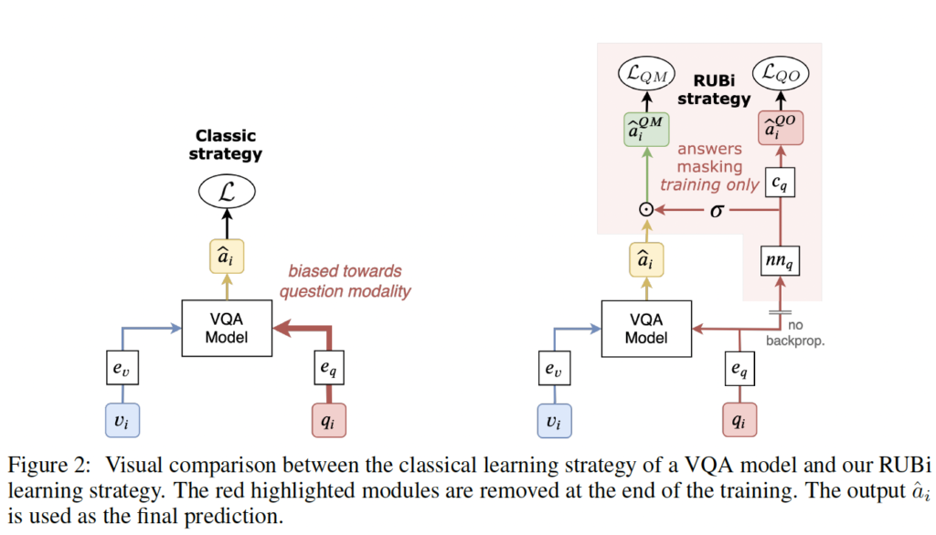 학습 동안, branch는 식 (1)에 제신된 형태의 VQA 모델이 biases를 학습하지 못하도록 방지하는 proxy 역할을 합니다. 학습이 끝나면, branch를 제거하고 VQA 모델의 prediction을 사용하기만 하면 됩니다. 간단하쥬?